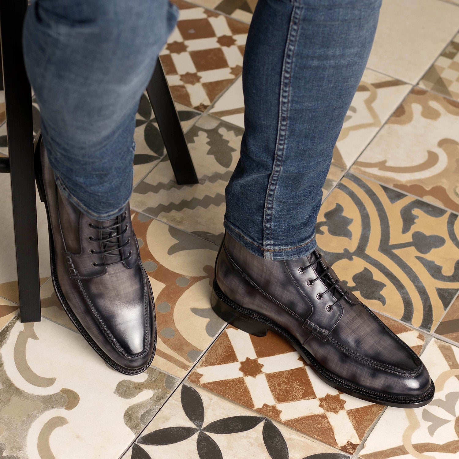 • Ambrogio Bespoke Men's Shoes Gray Patina Leather Moccasin Boots (AMB2402)