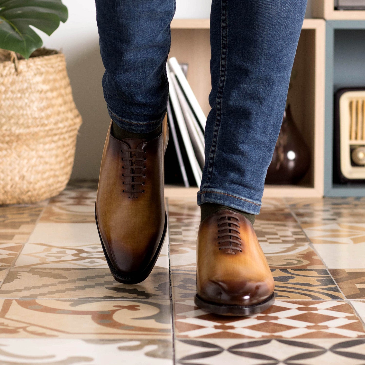 The technique used to achieve this artwork is known as ‘Anticatura’, which is the Italian word for antique finishing. It is a specialty of Italian and French maestro shoemakers. Entrusted to the hands of the antique finisher, the upper part of the shoe becomes a work of art. The Anticatura method is a hand dyeing procedure of leather. It takes about 8-10 hours of work per pair to create a completely unique patina with an aged effect.