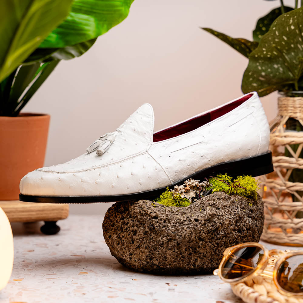 Marco Di Milano Aubiere Men's Shoes White Exotic Ostrich Tassels Loafers (MDM1198)