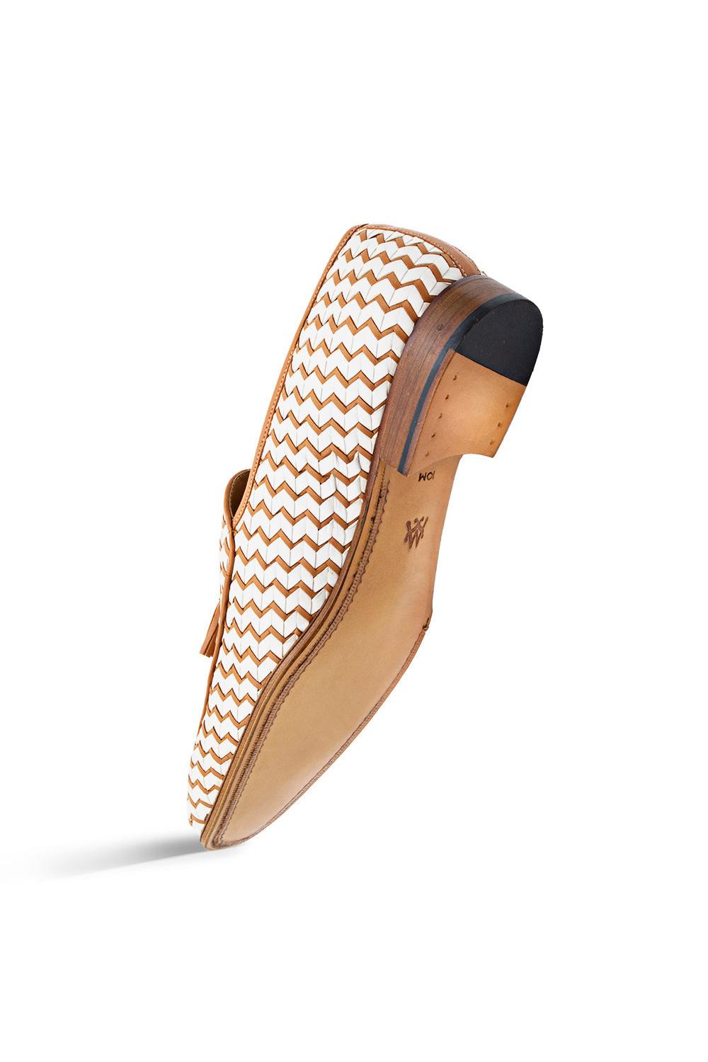 Look no further this summer for the epitome of footwear elegance. The Sants Belgian loafer in authentic woven calfskin features a fresh two-tone, warm-weather design with contrast tassels and opanka upturned artisan sole. Look sensational!