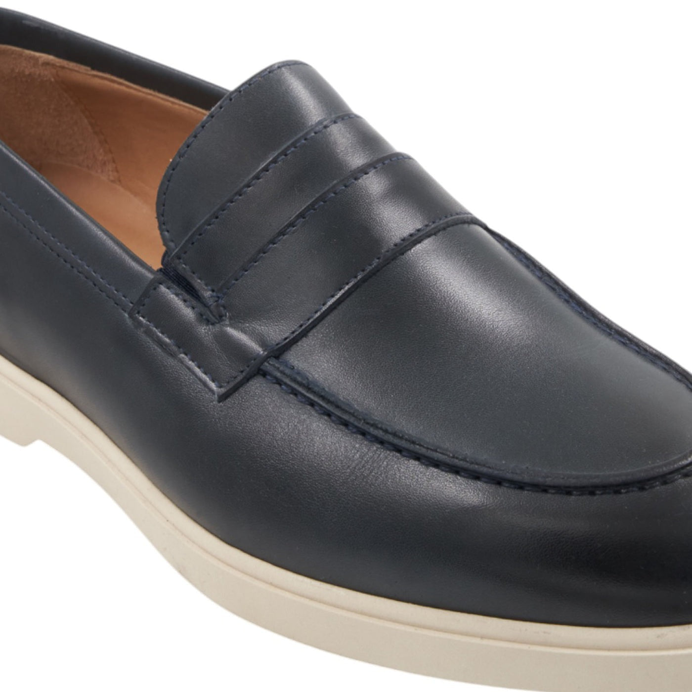 A refined expression of casual sophistication. Crafted in a rich navy leather, this modern loafer merges timeless design with contemporary comfort. The clean silhouette is complemented by a sleek moc toe and tonal stitching, offering a minimalist yet elevated look. A contrast ivory rubber sole adds a fresh, sporty edge while ensuring all-day wearability. Finished with a leather lining and cushioned insole, the Ezra is the perfect choice for effortless style—equally suited for business casual days or refined weekend wear.