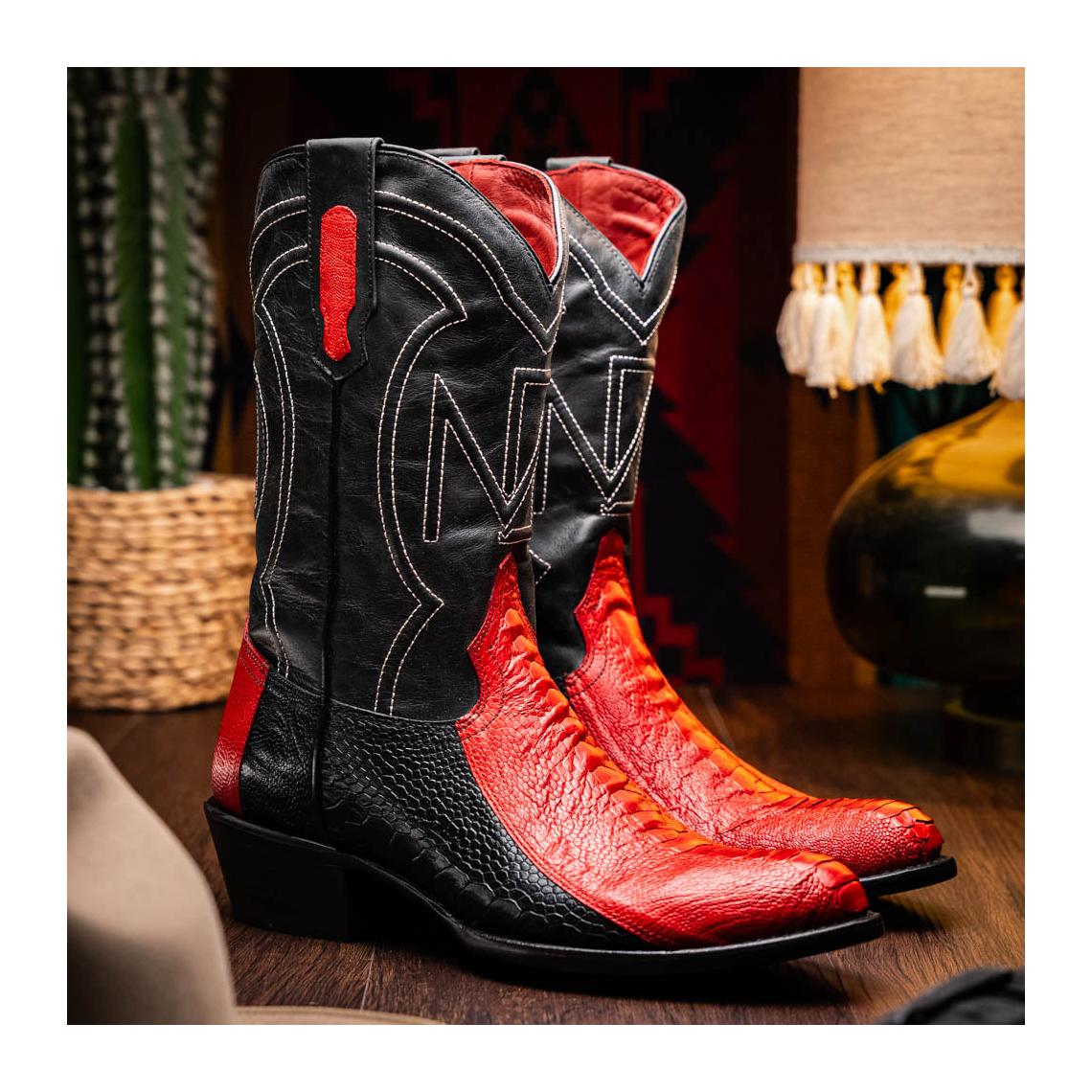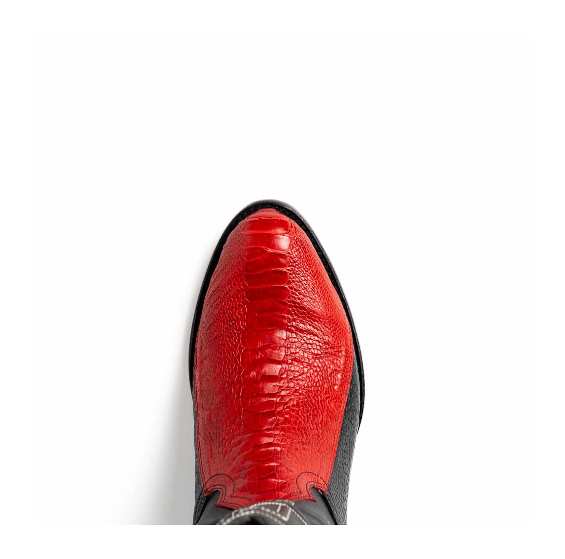 The DENVER boot delivers bold style and exotic elegance with every step. Crafted from genuine ostrich leg skin, this round-toe boot showcases the natural ridges and grain of the leather—rich in detail and unmistakably luxurious. Its deep red vamp is perfectly balanced by a black full-grain leather shaft with matching red stitching and pull tabs, bringing together contrast and craftsmanship in true Western fashion.