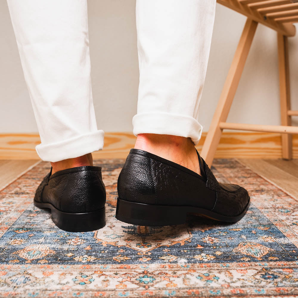 Introducing the FANGIO, our classic penny loafer with an exotic twist. Crafted with genuine ostrich leg and ostrich quill, these loafers feature a unique hand finish for a distinctive appearance. The easy slip-on application and full leather outsole make them a versatile choice for dressing up with your favorite jeans, slacks, or shorts, creating a sophisticated look with an exotic touch.