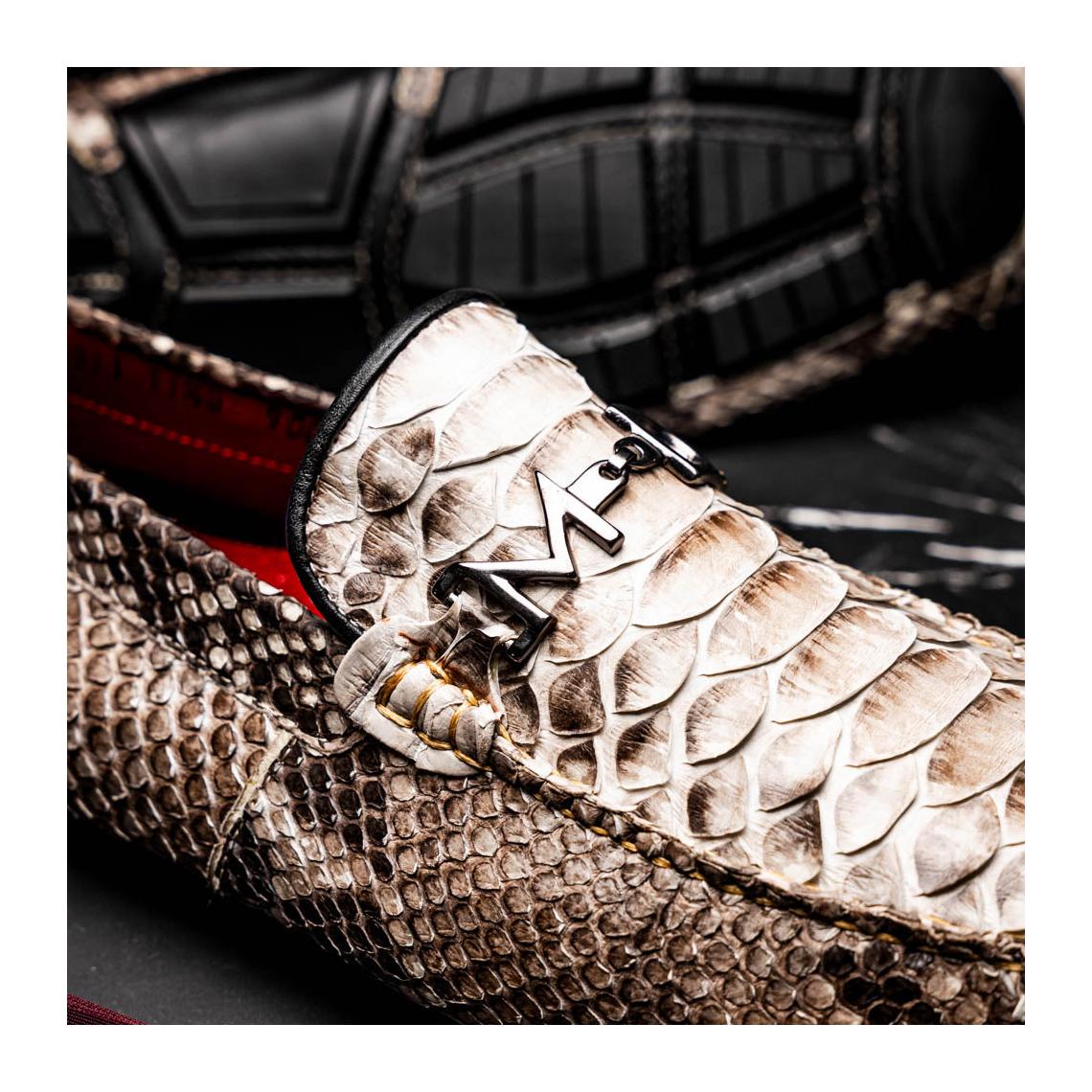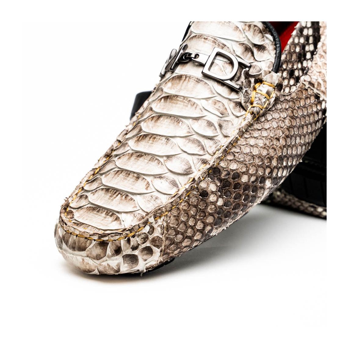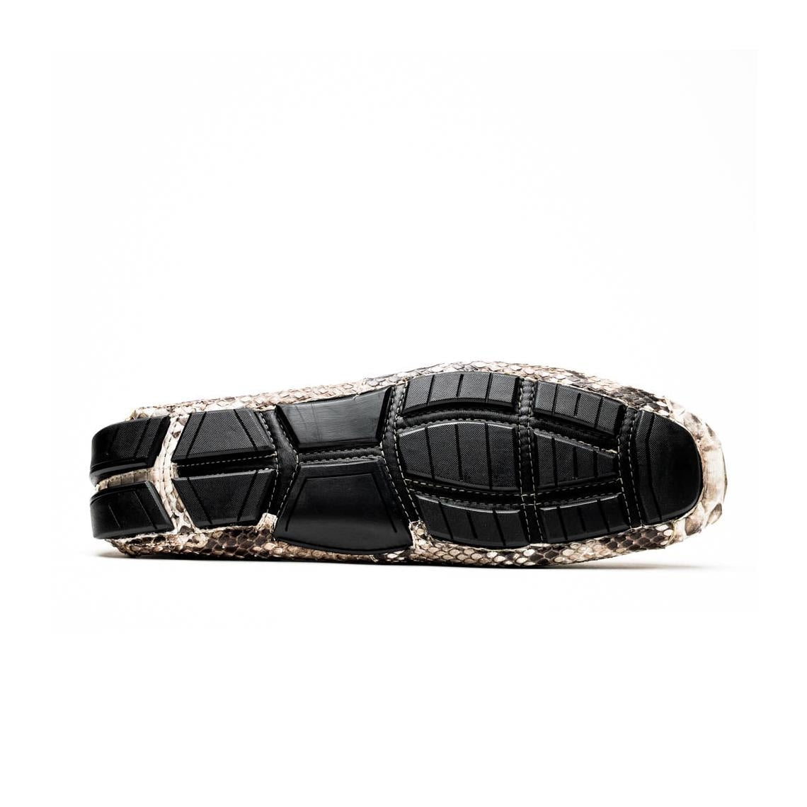 Introducing the CAPRI driver—a striking loafer handcrafted from genuine python skin, blending raw elegance with breezy sophistication. Its textured pattern and natural tones evoke the effortless charm of the Mediterranean, while the sleek silhouette makes it a bold choice for elevated everyday wear.