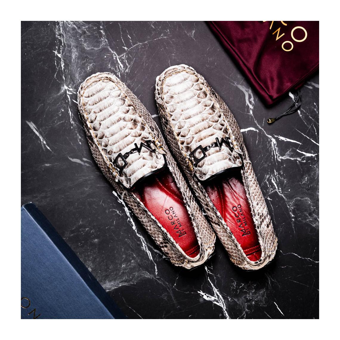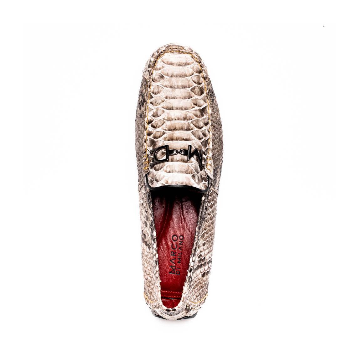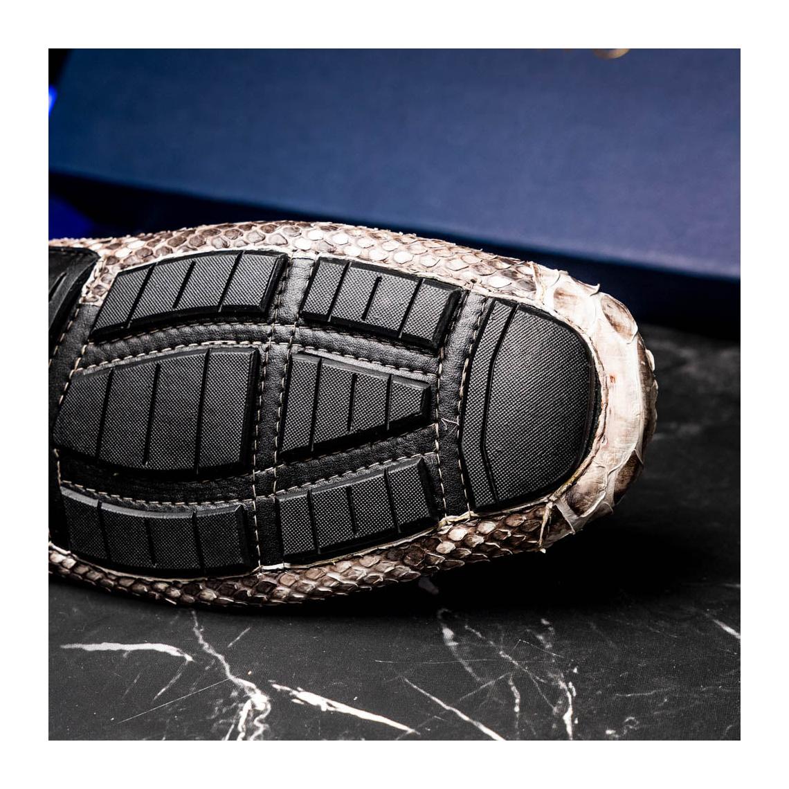 Introducing the CAPRI driver—a striking loafer handcrafted from genuine python skin, blending raw elegance with breezy sophistication. Its textured pattern and natural tones evoke the effortless charm of the Mediterranean, while the sleek silhouette makes it a bold choice for elevated everyday wear.