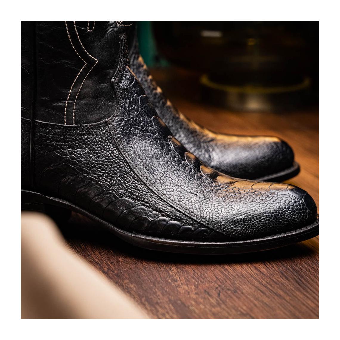 The DENVER boot delivers bold style and exotic elegance with every step. Crafted from genuine ostrich leg skin, this round-toe boot showcases the natural ridges and grain of the leather—rich in detail and unmistakably luxurious. Its deep red vamp is perfectly balanced by a black full-grain leather shaft with matching red stitching and pull tabs, bringing together contrast and craftsmanship in true Western fashion.