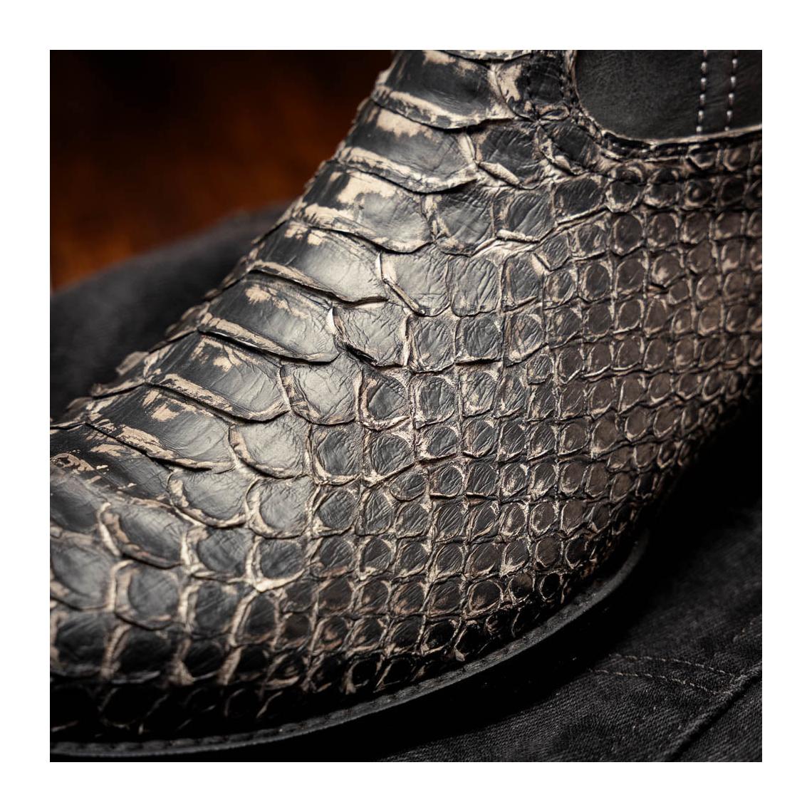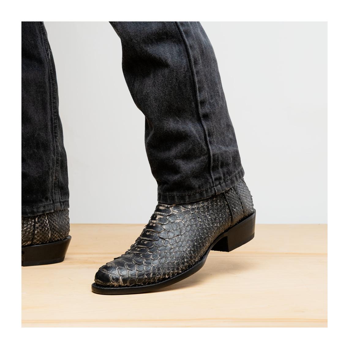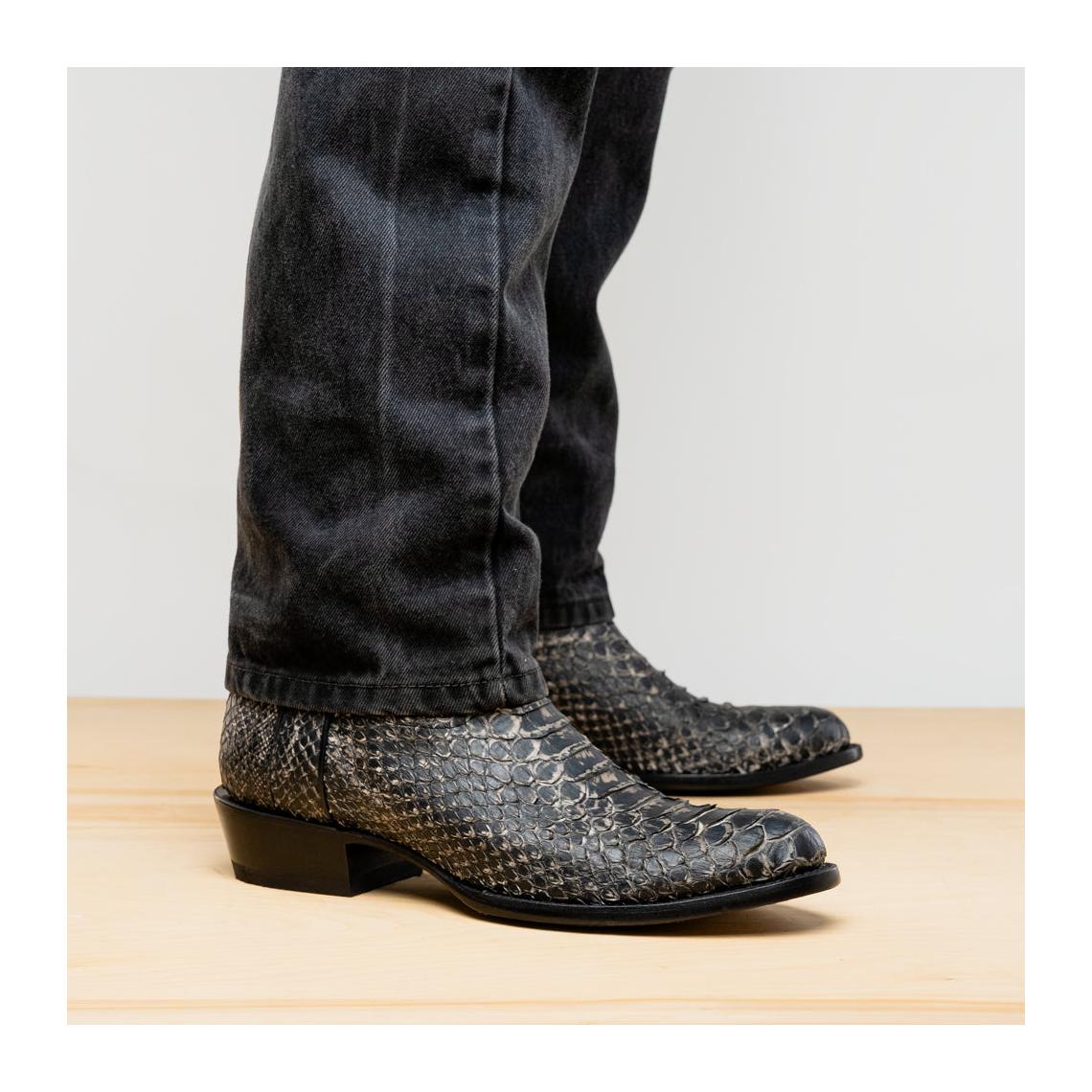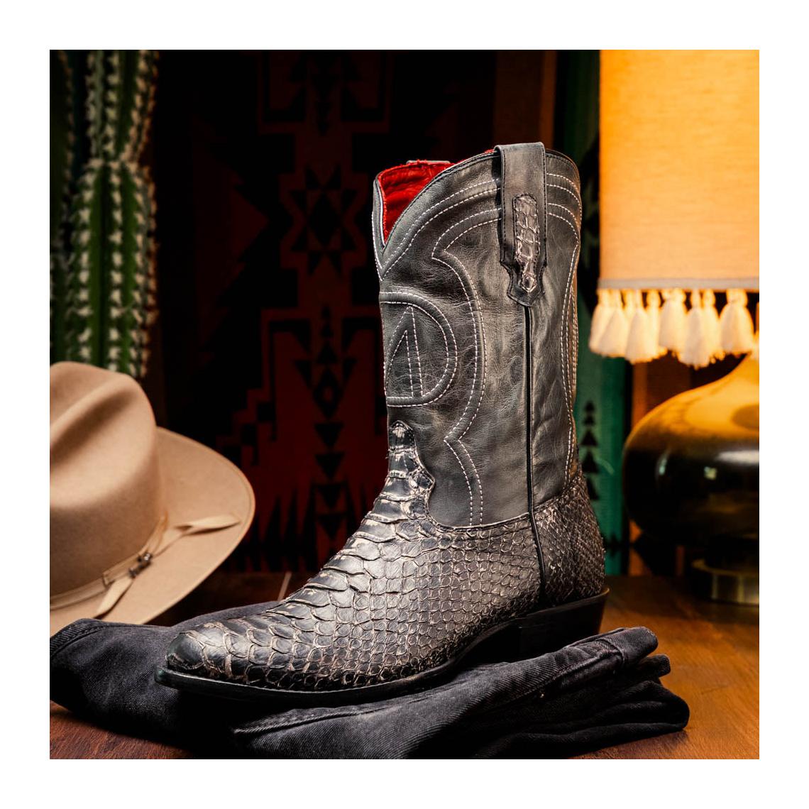 The KANSAS boot is a bold expression of authentic Western heritage elevated by luxury craftsmanship. Expertly handcrafted using genuine Python skin for the vamp and rich full-grain leather on the shaft, this piece delivers timeless cowboy attitude with a refined and modern edge. The contrast stitching and signature red interior lining add a distinctive flair—designed to turn heads whether you're on the ranch or the city streets.