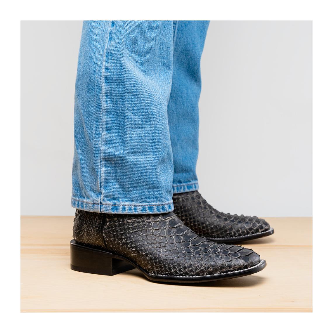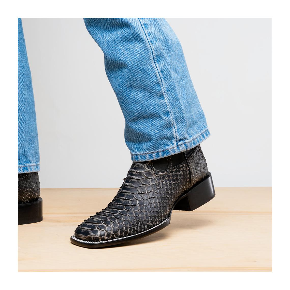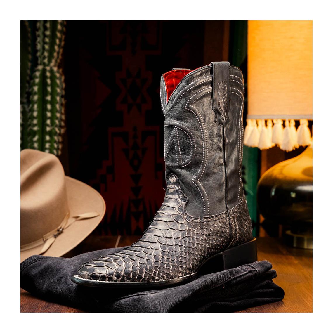 The MISSOURI boot captures the spirit of the West through bold design, master craftsmanship, and premium exotic materials. Handcrafted using genuine Python skin on the vamp and full-grain leather on the shaft, it delivers rich texture and visual contrast. The defining square toe adds a confident, modern twist to the classic cowboy profile, while the signature red leather lining brings a refined interior finish.