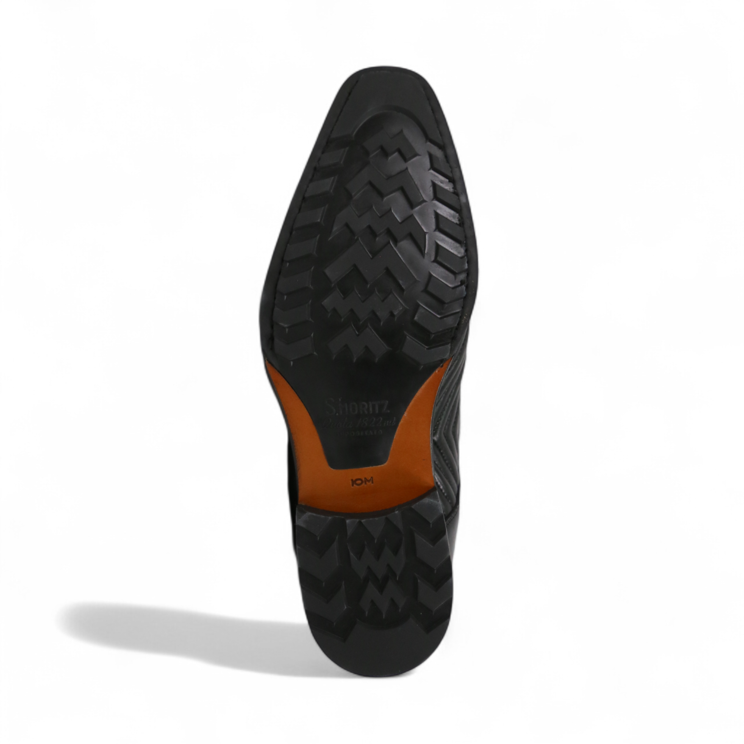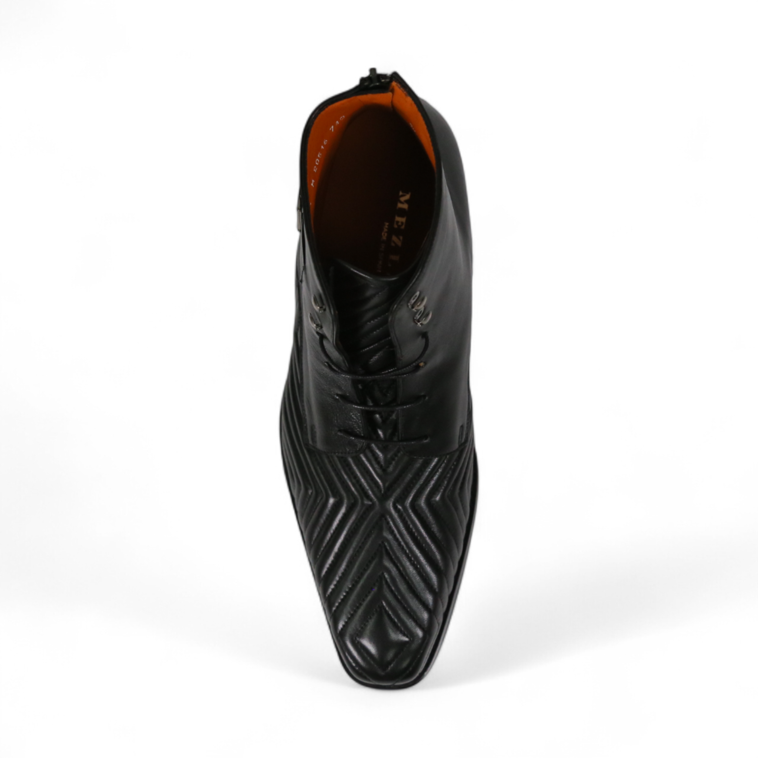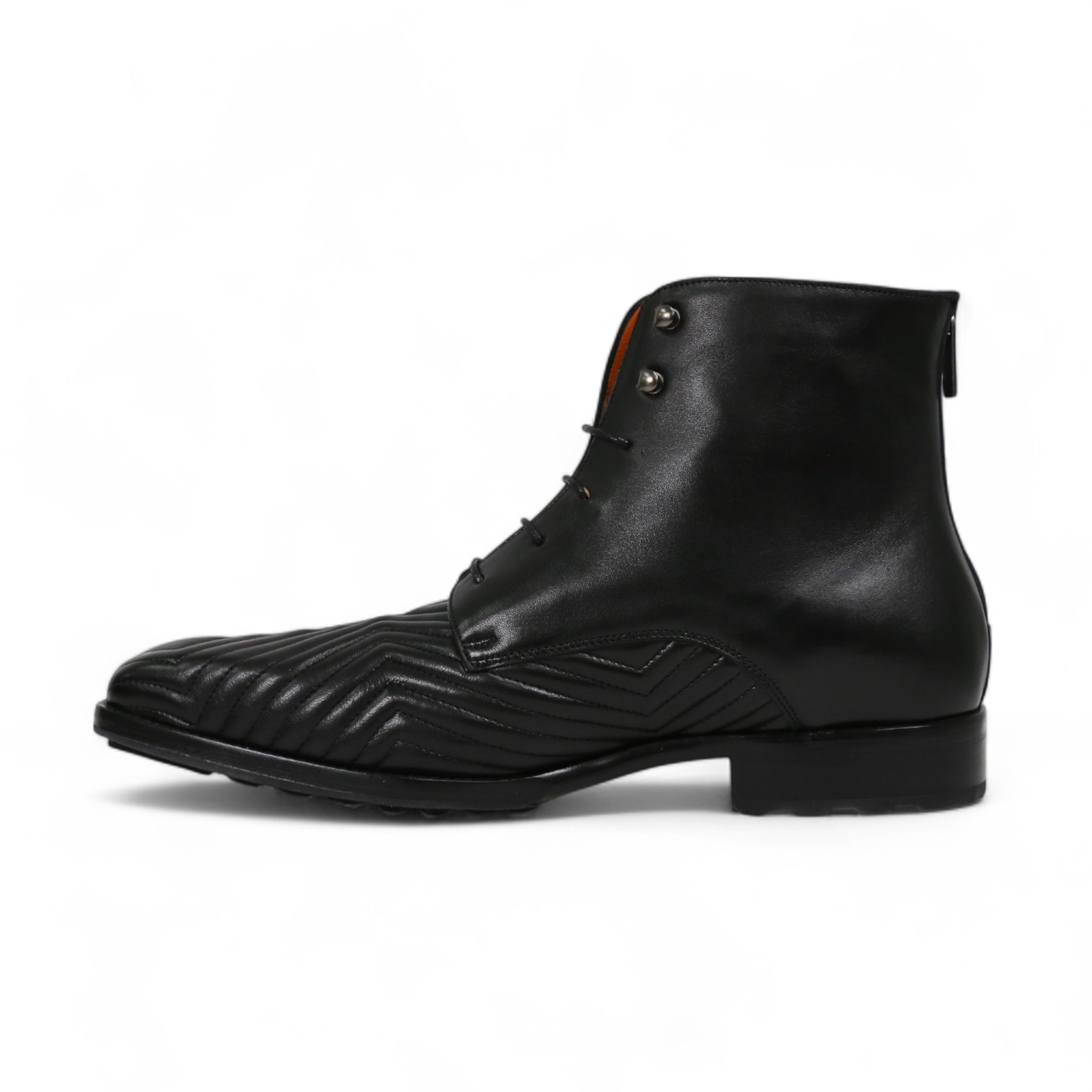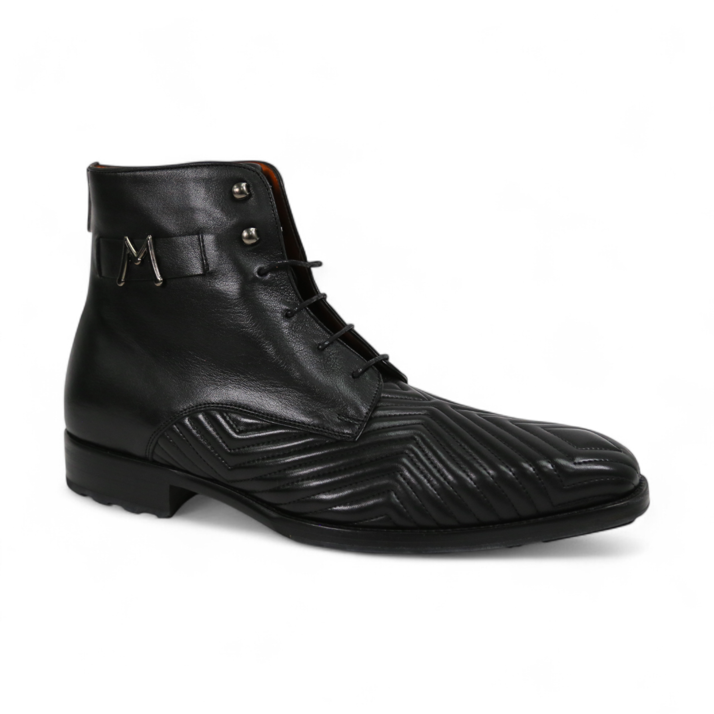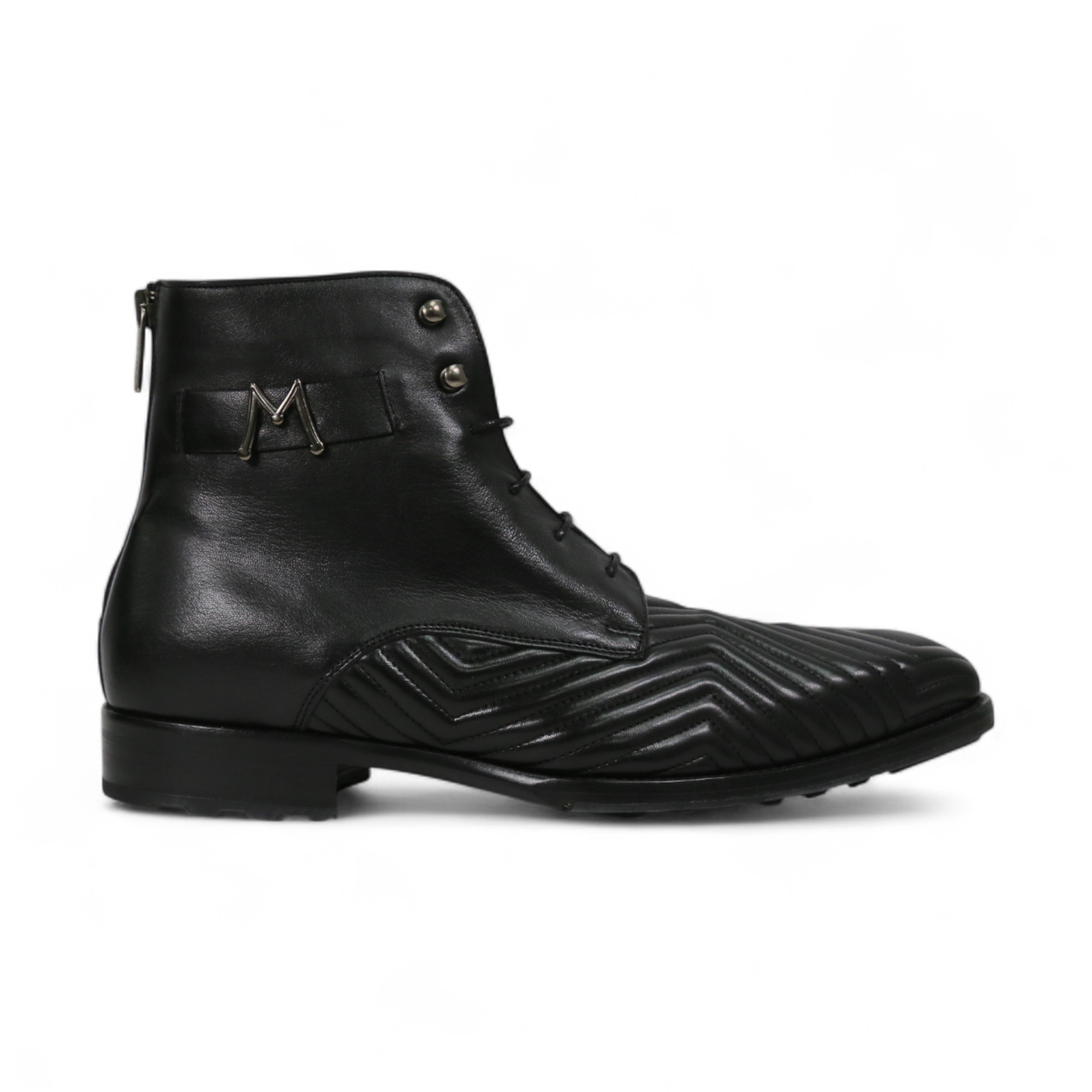 Mezlan's power-fashion lace up boot of the season! From its stitched quilted foot to its rubber/leather grid sole, the metallic details adorn this masculine boot in all its glory. Rev it up!