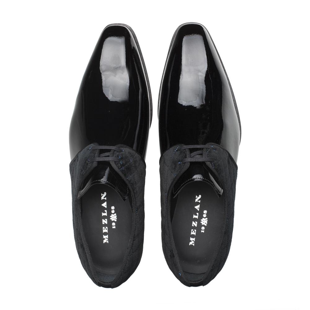 For your next upscale formal affair, this sophisticated patent leather 2-eyelet derby is crowned with an elaborate lace-plate and rear quarter of quilted black velvet with contrasting blue stitching to set it off perfectly. The details make this evening shoe sing out for the occasion.