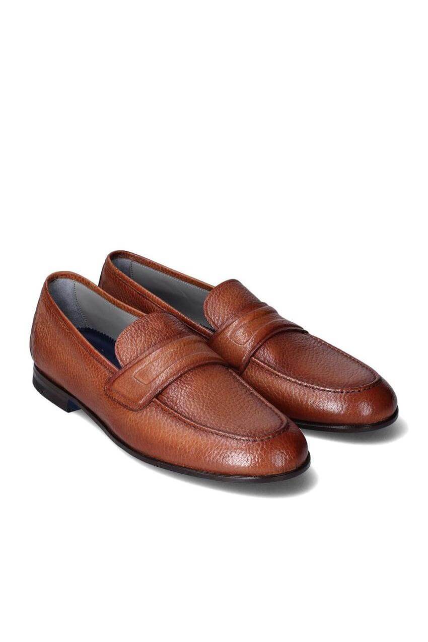 Crafted from hand-dyed deer leather in a rich tone, it stands out for its textured grain and natural suppleness. The Bologna construction combined with Blake stitching ensures lightweight comfort, while the leather sole with rubber insert delivers both refined style and stability.
