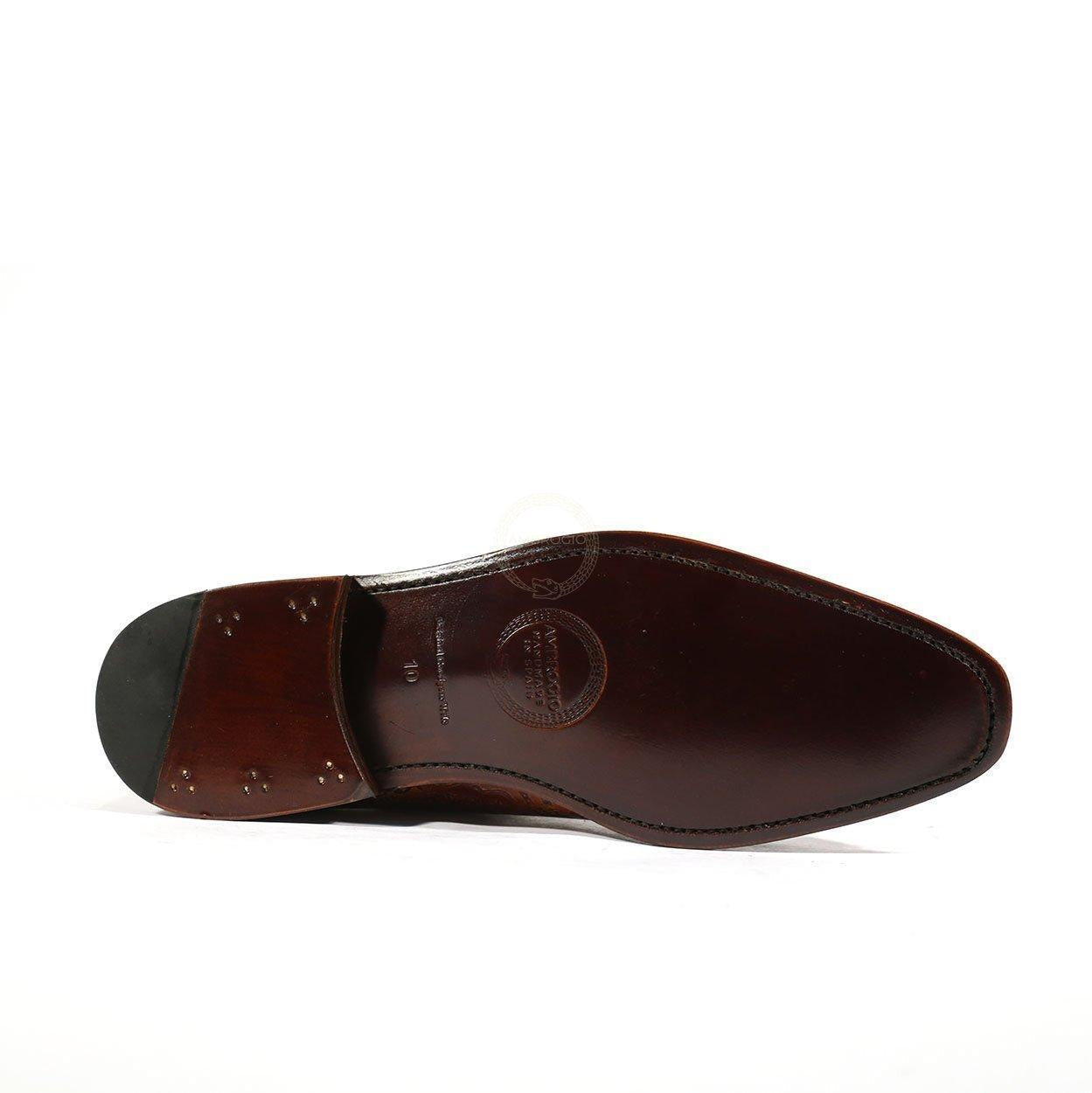 Hand cut from raw high-grade Italian crust leather, shoe patterns are engraved with beautiful Egyptian hieroglyphic motifs. Applying natural dyes and oils -and lots of savoir-faire- our Maestro colorist achieves this unique and staggering look that we call "Museum" Patina. After much hand brushing and polishing, the glacé effect is jaw-dropping, as you can see in the pictures.