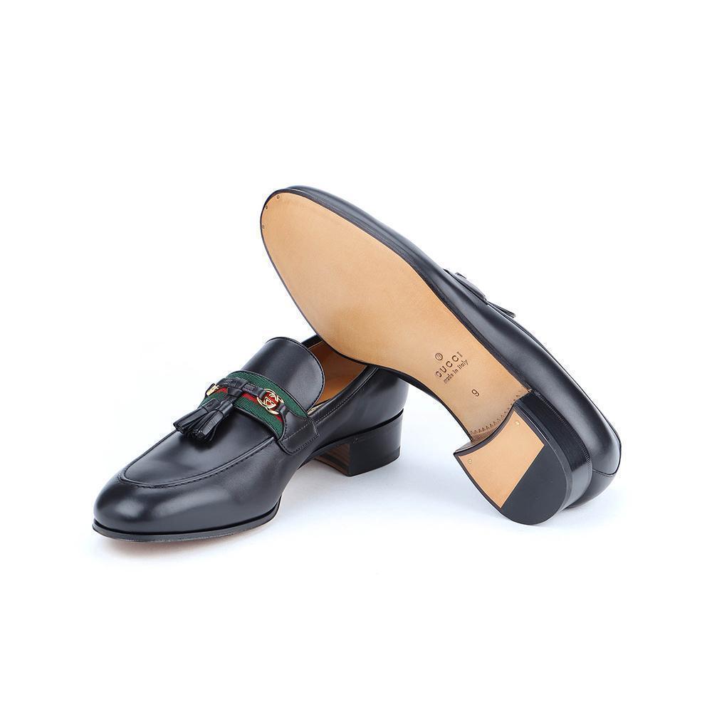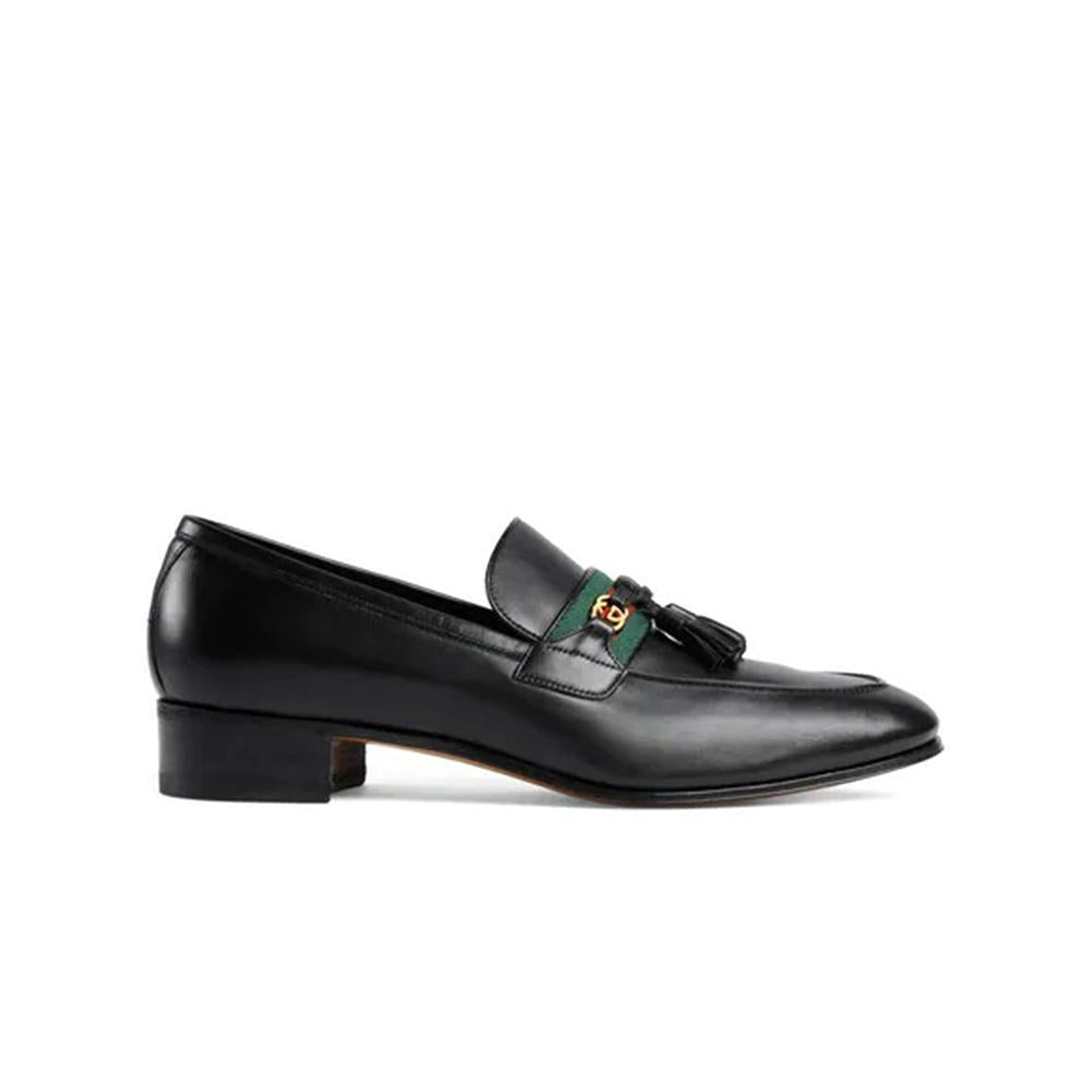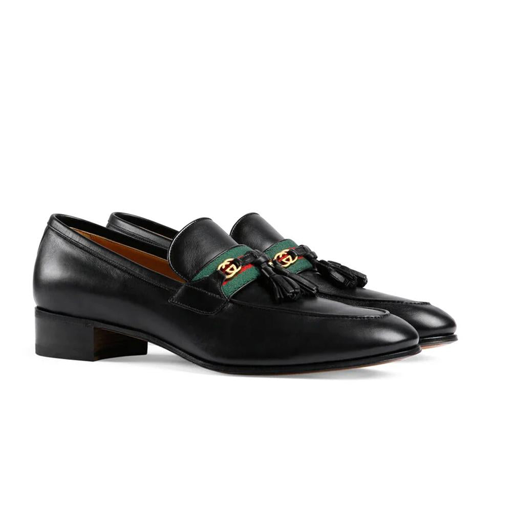 • Gucci 624720 1066 Men's Shoes Black Calf-Skin Leather with Web and Interlocking G Tassels Loafers (GGM1721)