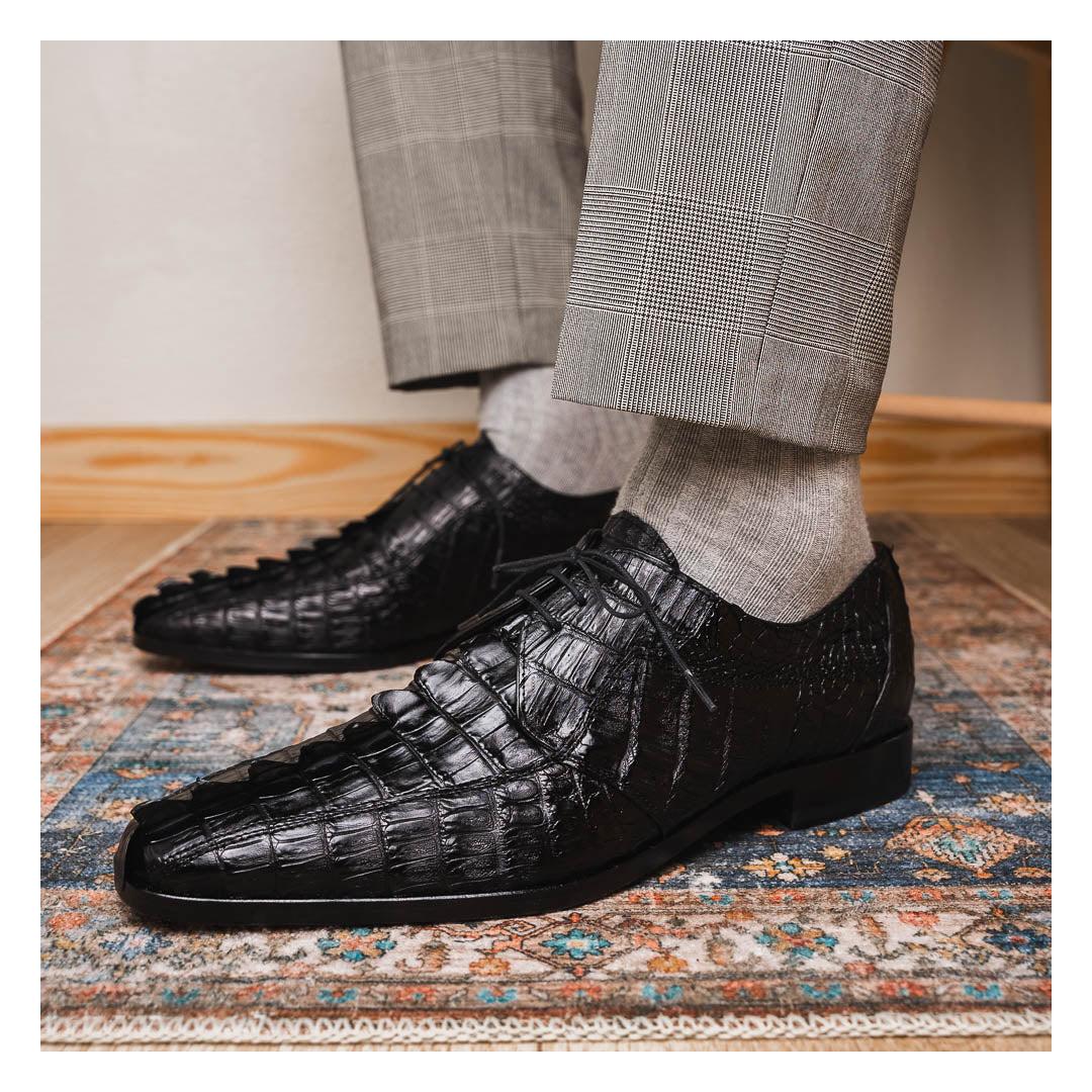 The CANCUN is our stunning genuine hornback caiman crocodile dress derby's featuring a 3D crocodile scale toe box, tasseled laces, and a polished hand finish that makes the crocodile texture pop. Dress these up with your favorite jeans or slacks for an out-of-this-world look.