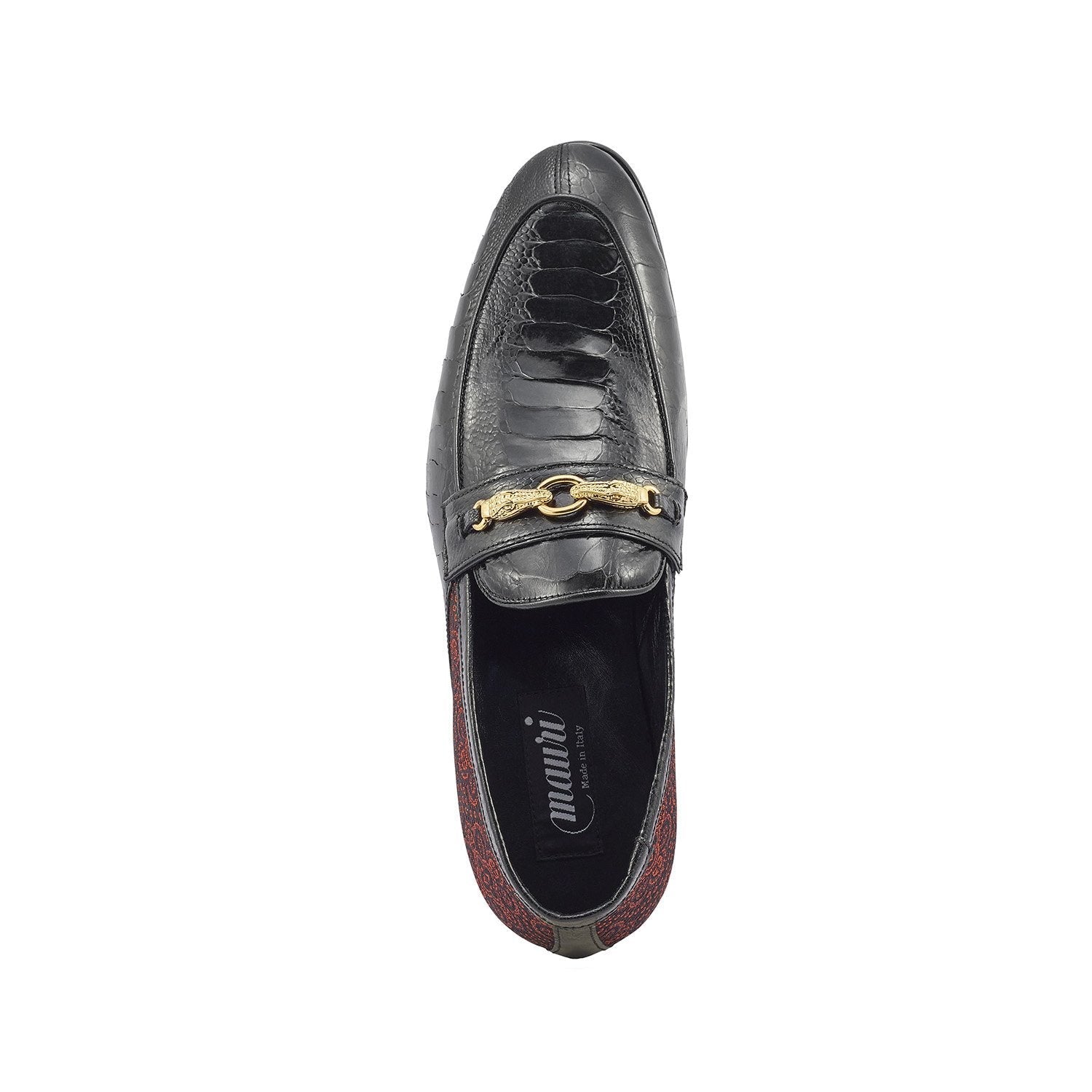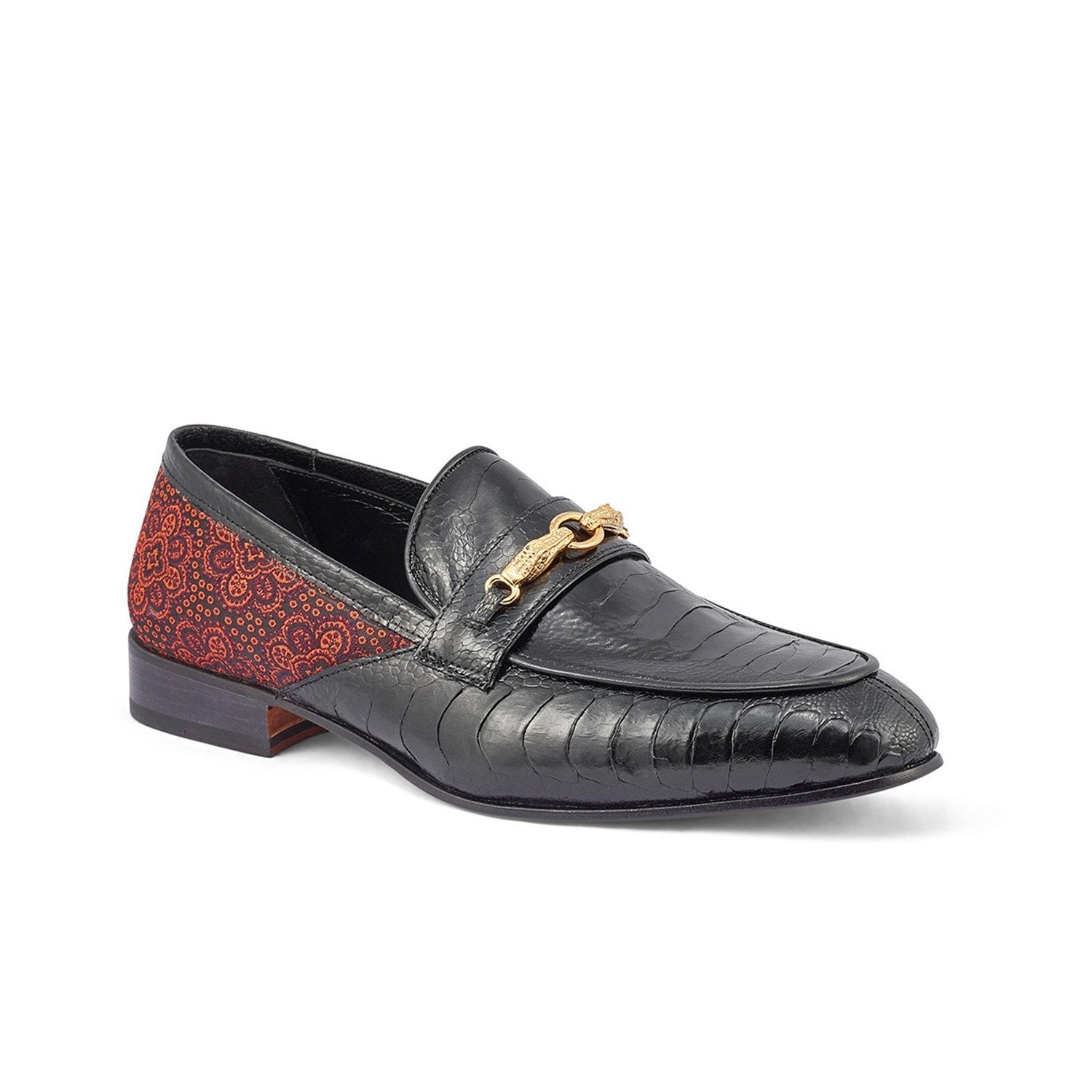 • Mauri 4946 Monet Men's Shoes Black & Coral Red Exotic Ostrich Leg / Matahari Fabric Horsebit Loafers (MA5398)